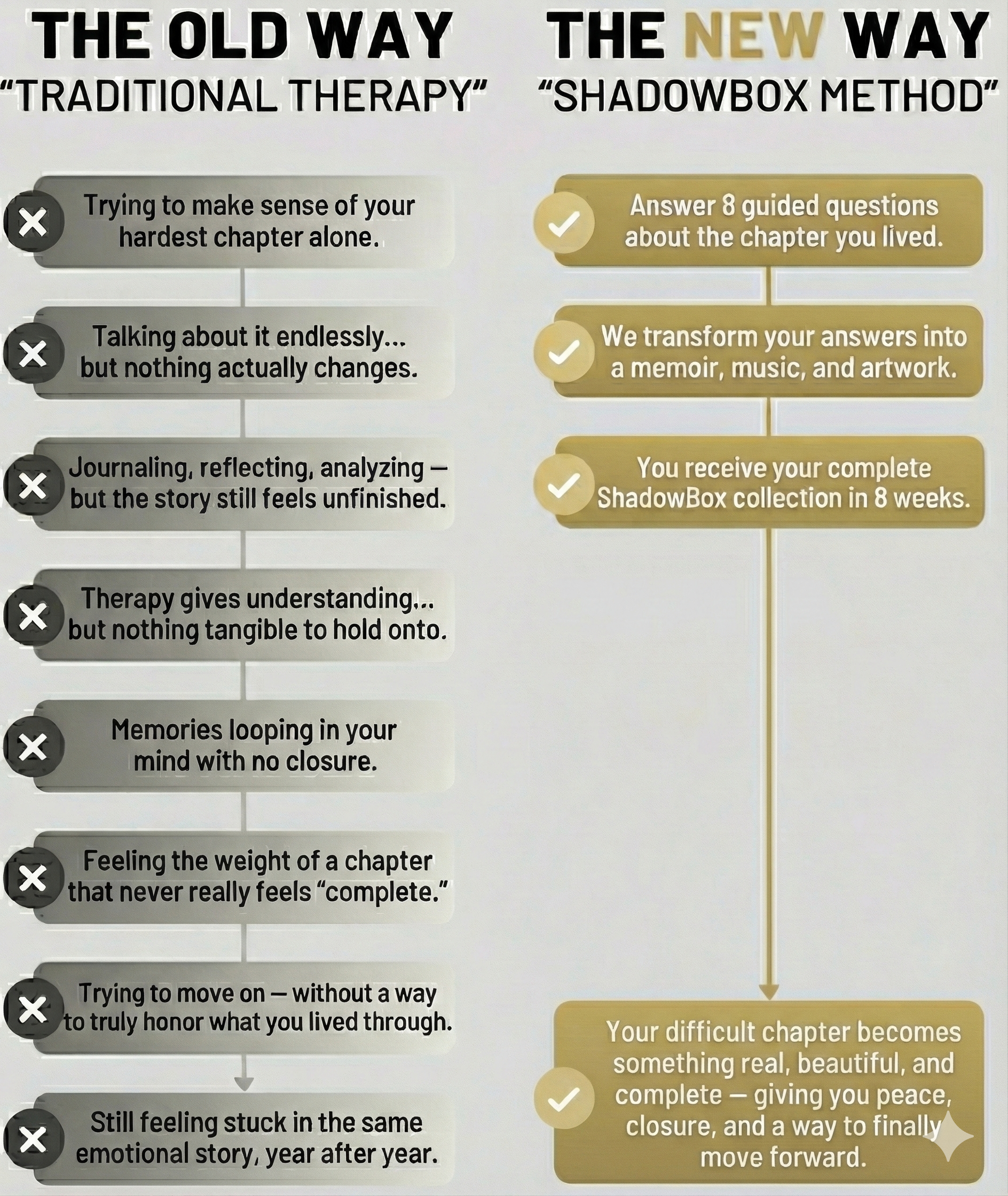 The ShadowBox System is a method for closing your hardest chapter through an 8-week guided journey. You answer 8 questions in sessions, and your story is transformed into three forms: written memoir, original music, and custom artwork. It's not therapy, not memoir writing, not DIY—it's a closure system that turns your story into something beautiful that honors what you survived.