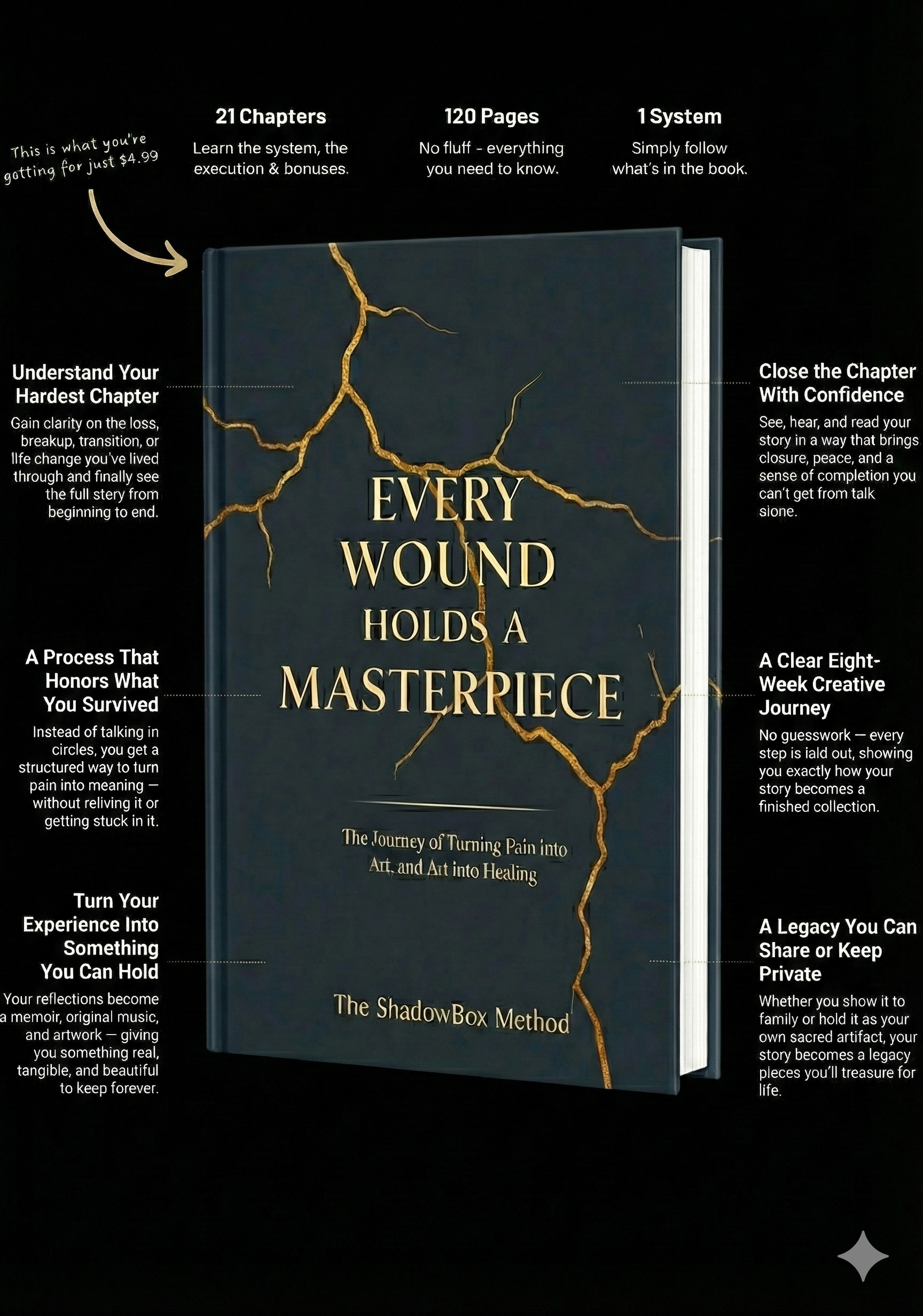 You're getting the complete Every Wound Holds A Masterpiece e-book (160+ pages) that explains The ShadowBox System—how to close your hardest chapter by turning your story into memoir, music, and art. Plus, you're getting all 7 bonuses listed above completely free.