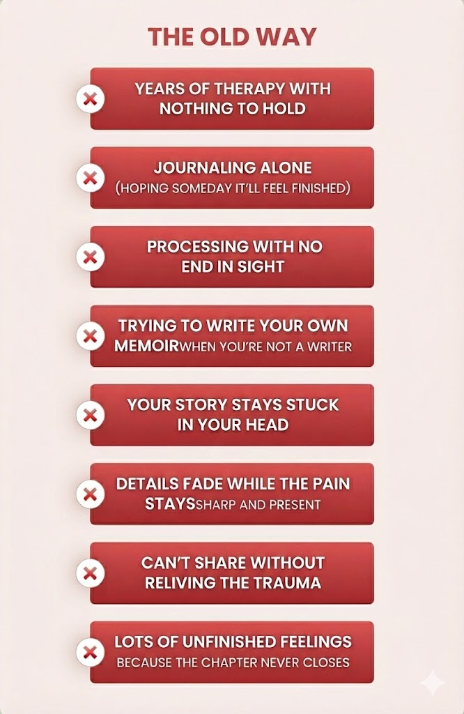 I've read every self-help book. Been in therapy for four years. Understand my patterns, my triggers, my childhood wounds—all of it. But I was still stuck. Still replaying the same conversations in my head. Still waking up at 3 AM thinking about what I should've said. ShadowBox didn't ask me to analyze anything else. It asked me to tell the story one more time—but this time, someone was going to do something with it. The 8 sessions felt like closure I didn't know I needed. And when I got my memoir, I put it on the shelf and thought: okay. It's done. I can stop carrying this now. That sounds small, but it's not. I haven't thought about him in weeks. Not because I'm avoiding it—because the chapter is actually closed.